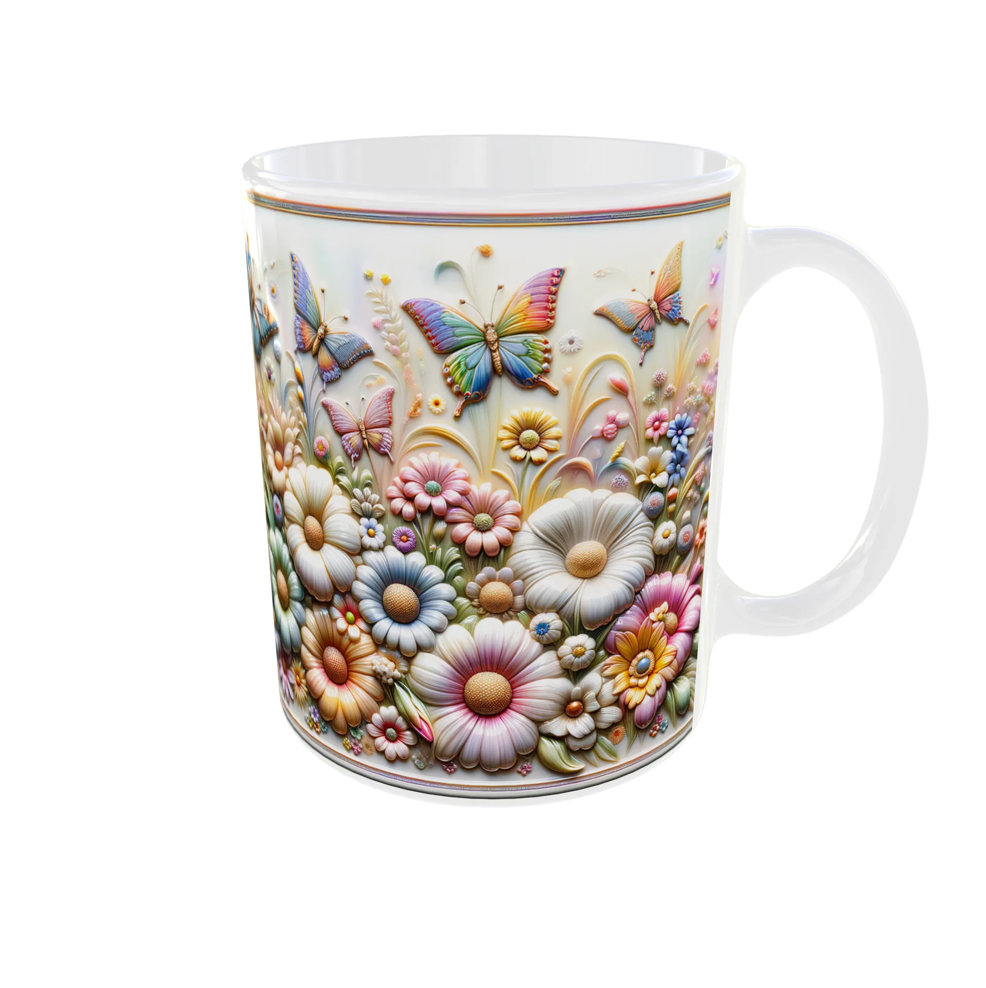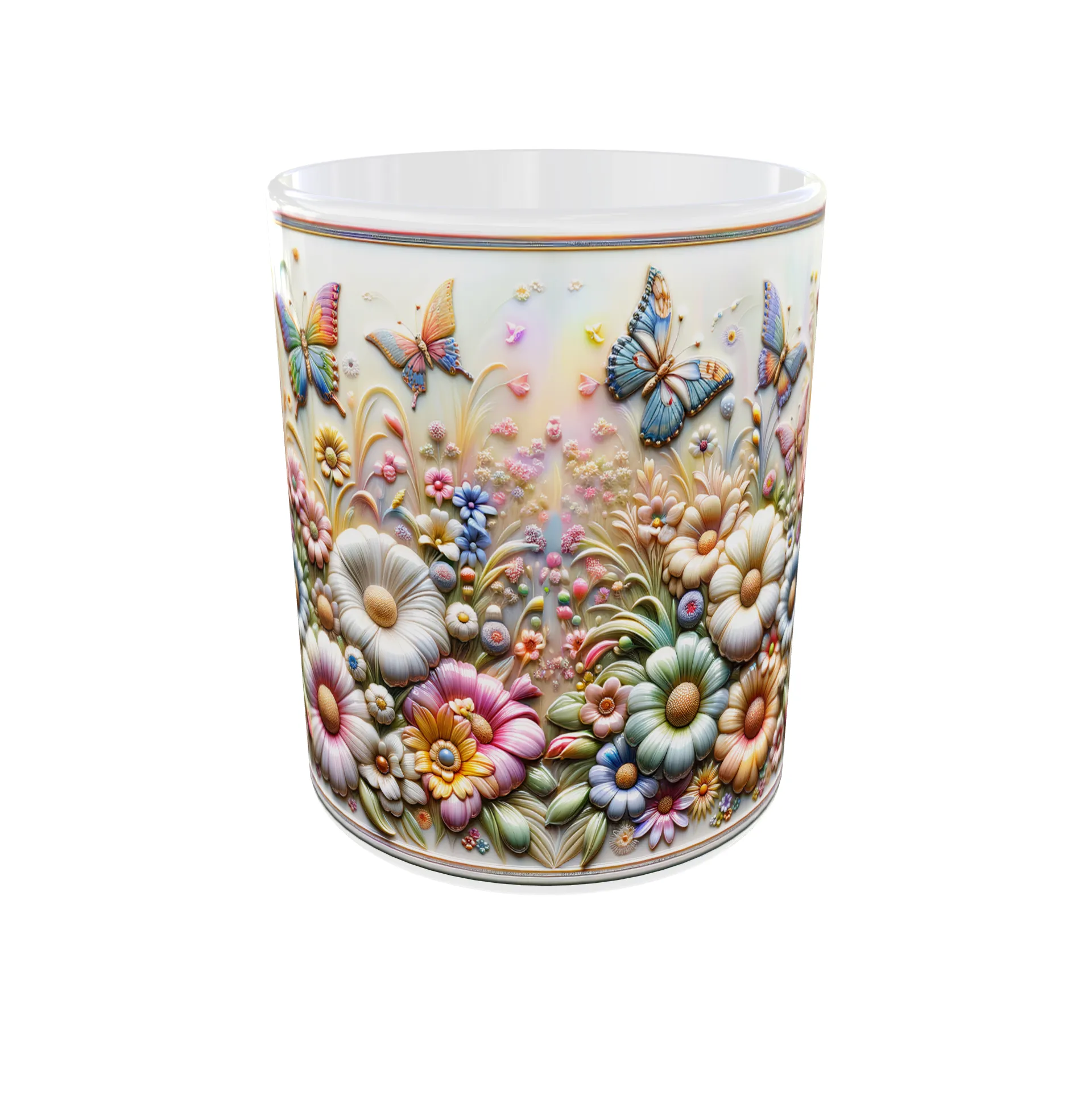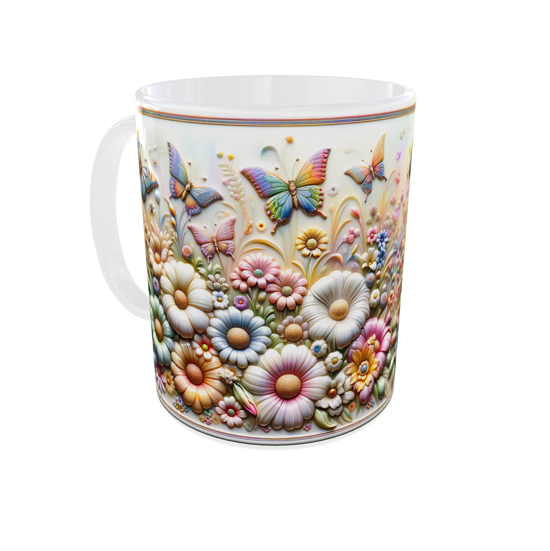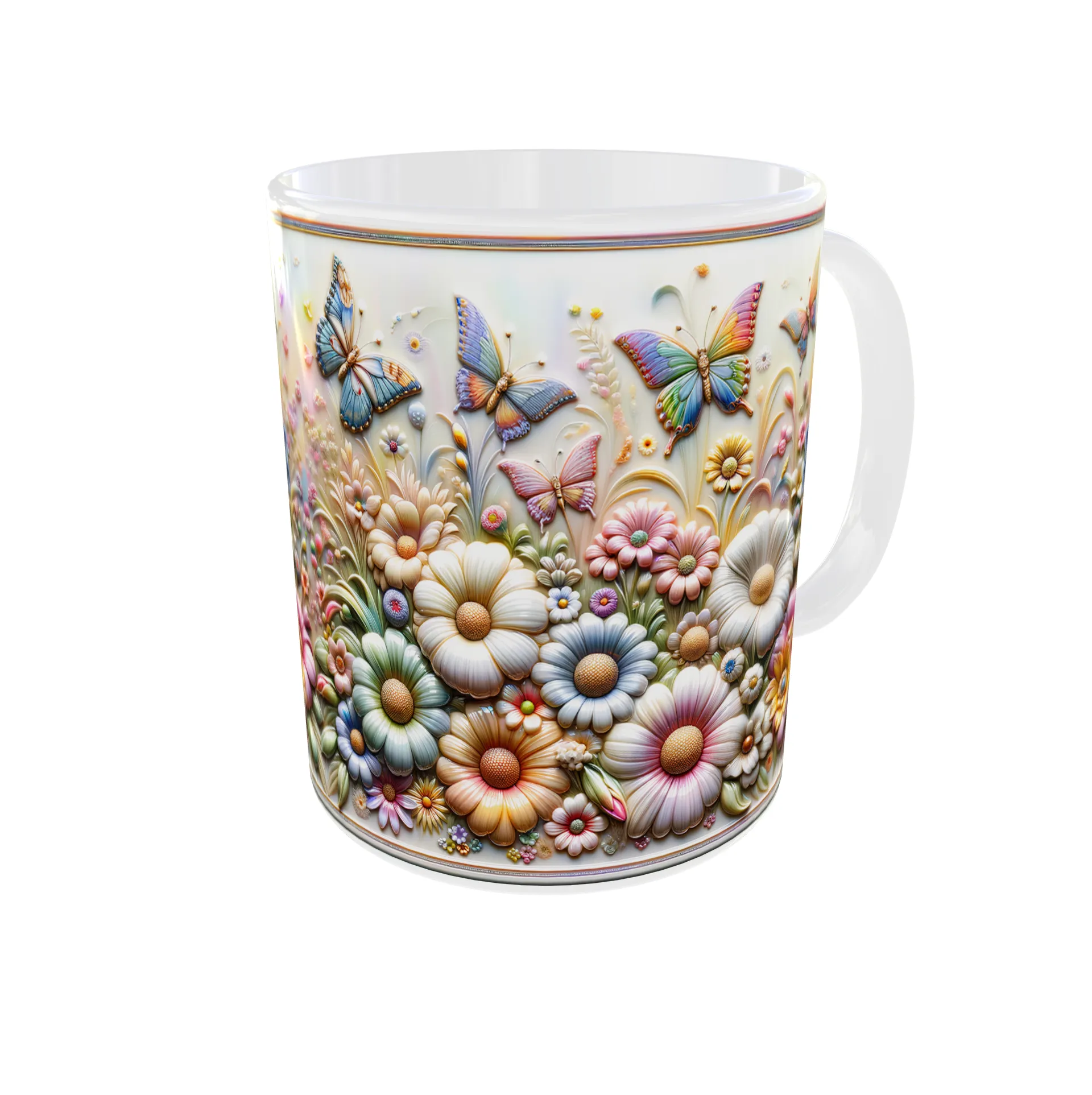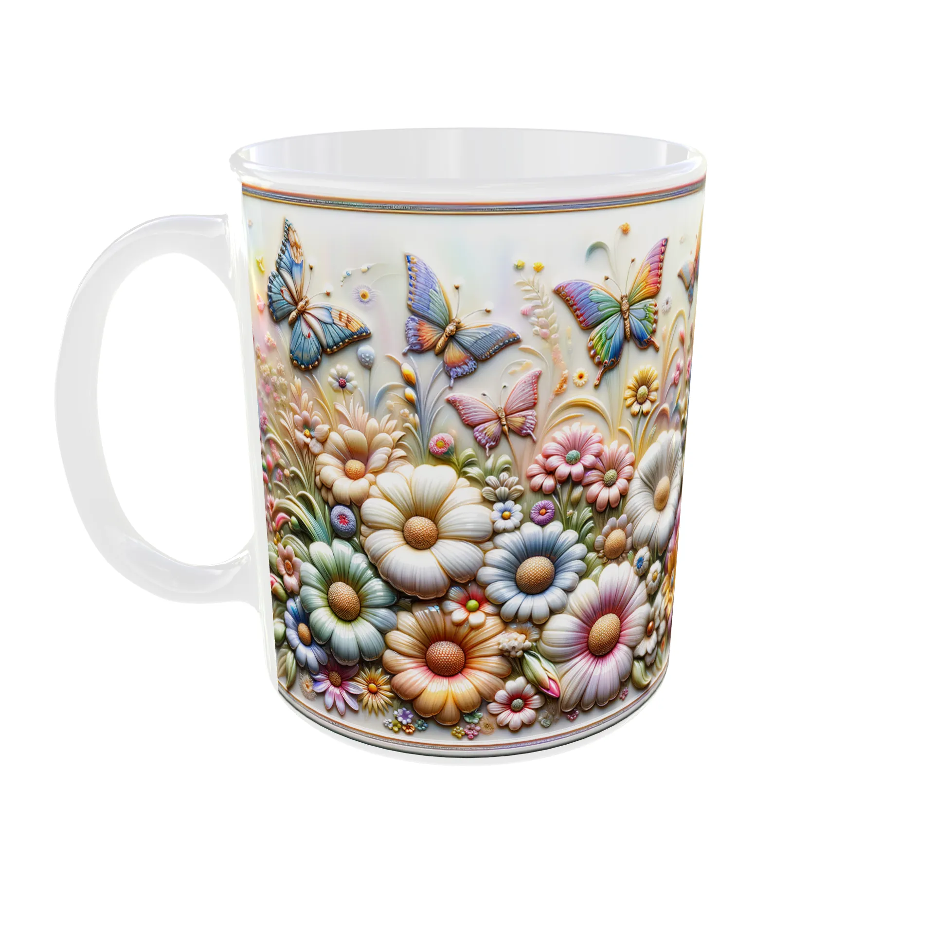The mug’s design is the prominent feature; it doesn’t look like simply a printed image, but appears to be an embossed or three-dimensional design. The main design element is a profusion of flowers and butterflies. The flowers are predominantly daisies and similar blooms in various pastel shades of pink, purple, yellow, and white. They are densely clustered together, overlapping and creating a sense of abundance. The flowers are rendered with considerable detail, showcasing their individual petals, centers and leaves.