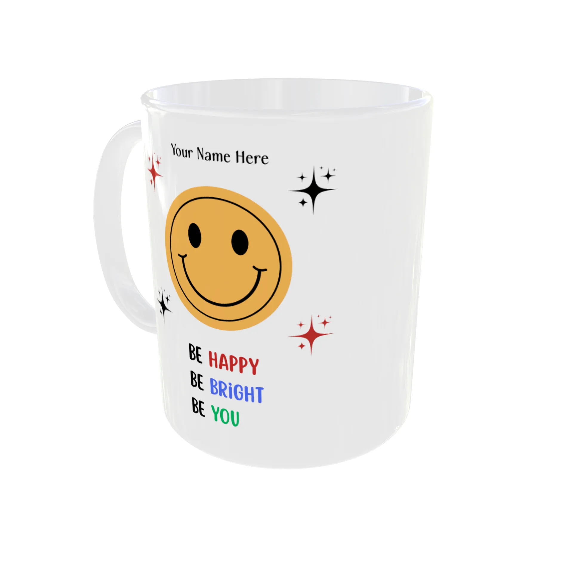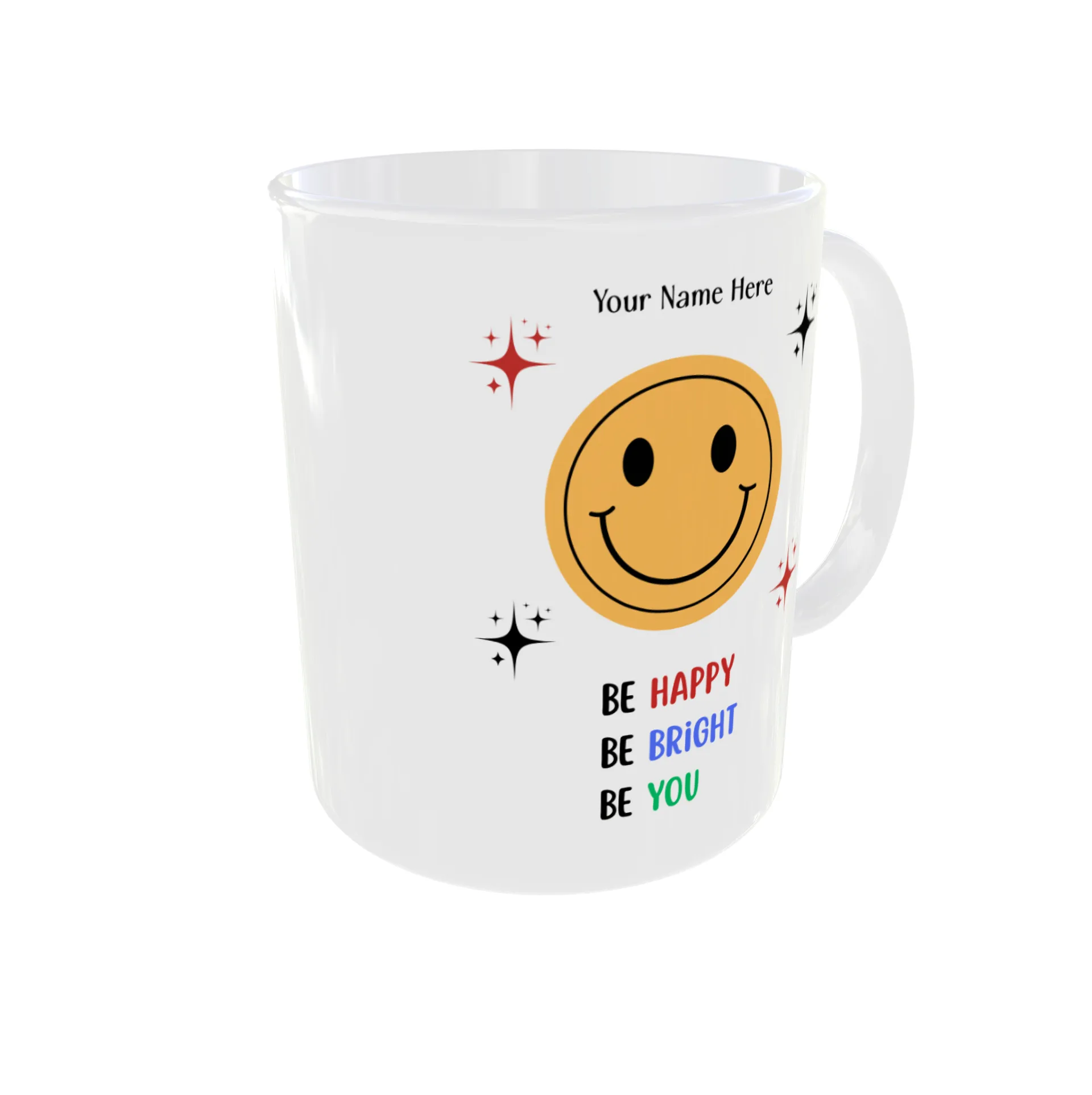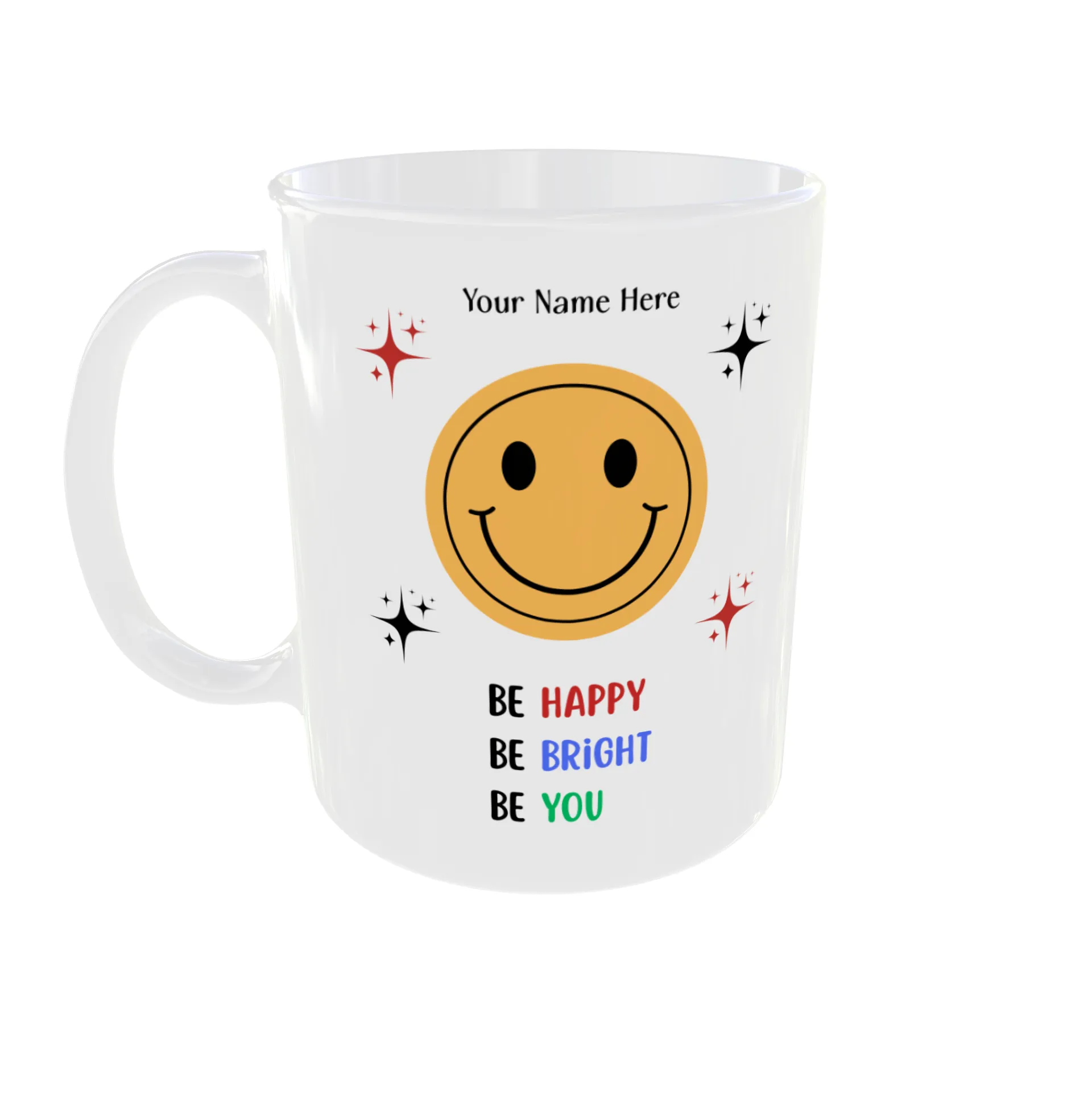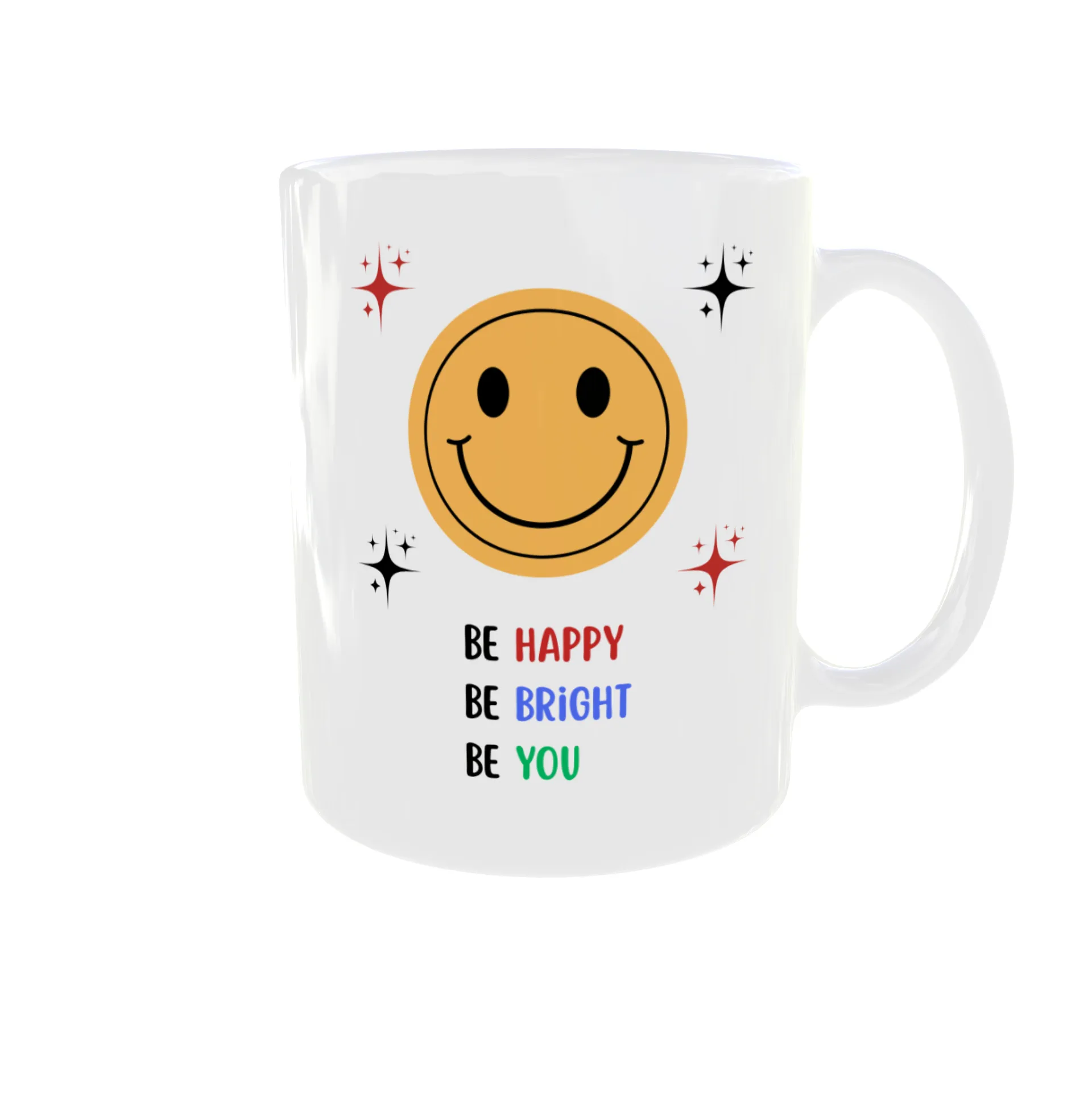 Brighten up your morning routine with this delightful mug featuring a classic smiley face and an uplifting message. The phrase “Be Happy, Be Bright, Be You” is printed in vibrant colors under the smiley face, serving as a daily reminder to embrace positivity and authenticity. The design includes colorful sparkling stars, adding a touch of whimsy and charm. Perfect for coffee, tea, or any beverage, this mug is sure to bring a smile to your face with every sip. It makes a wonderful gift for friends, family, or anyone who needs a little boost of happiness in their day.