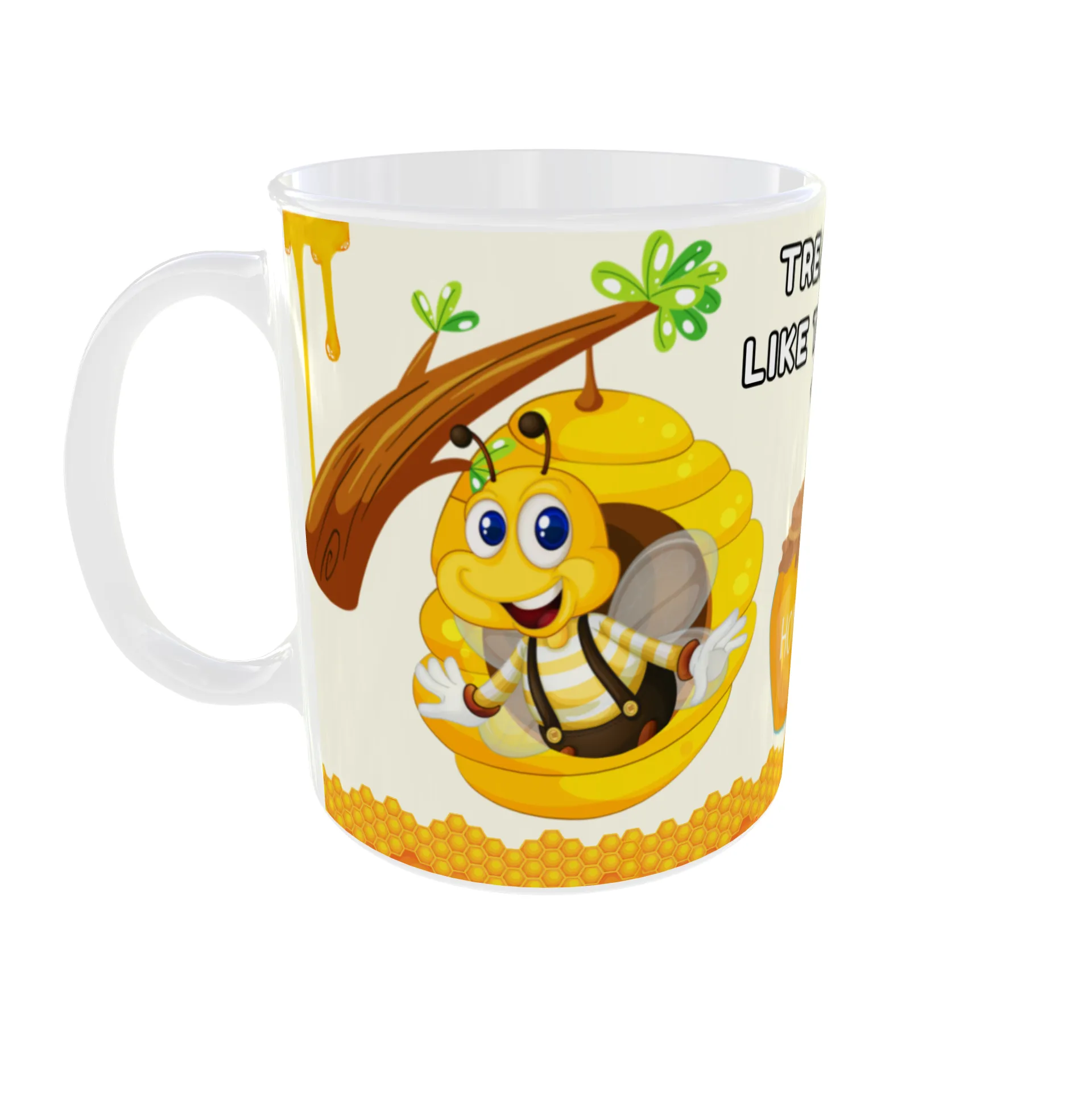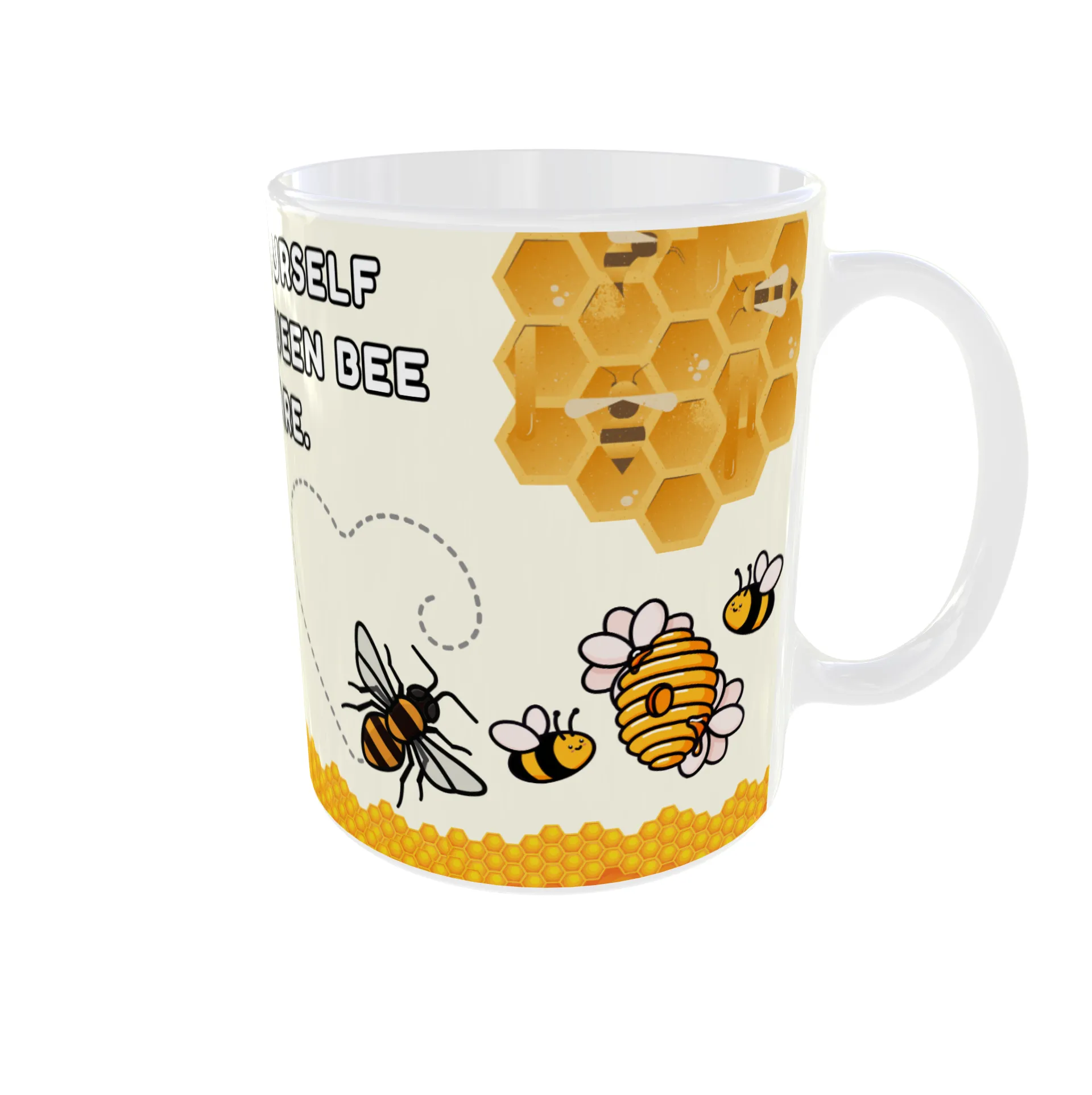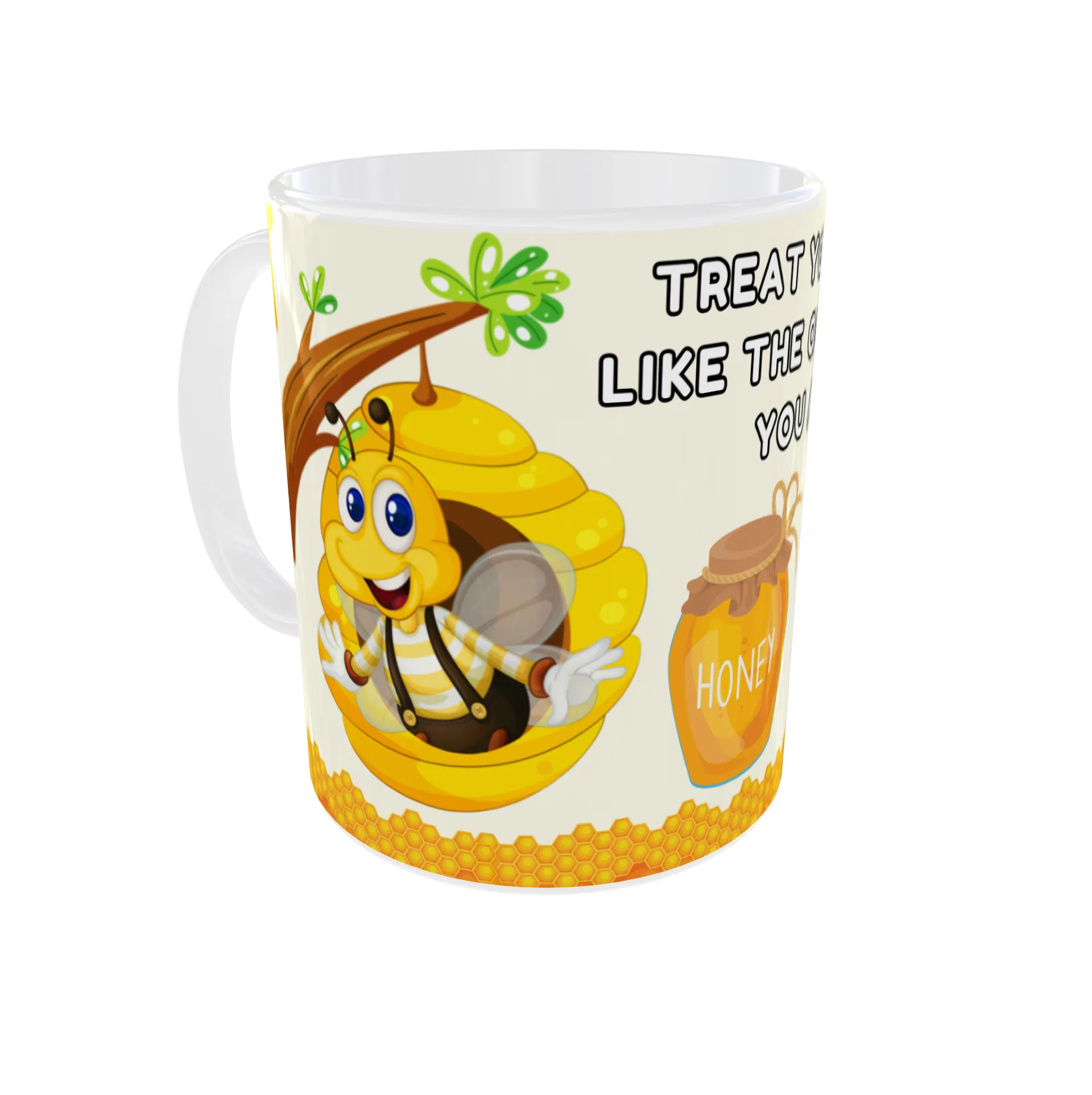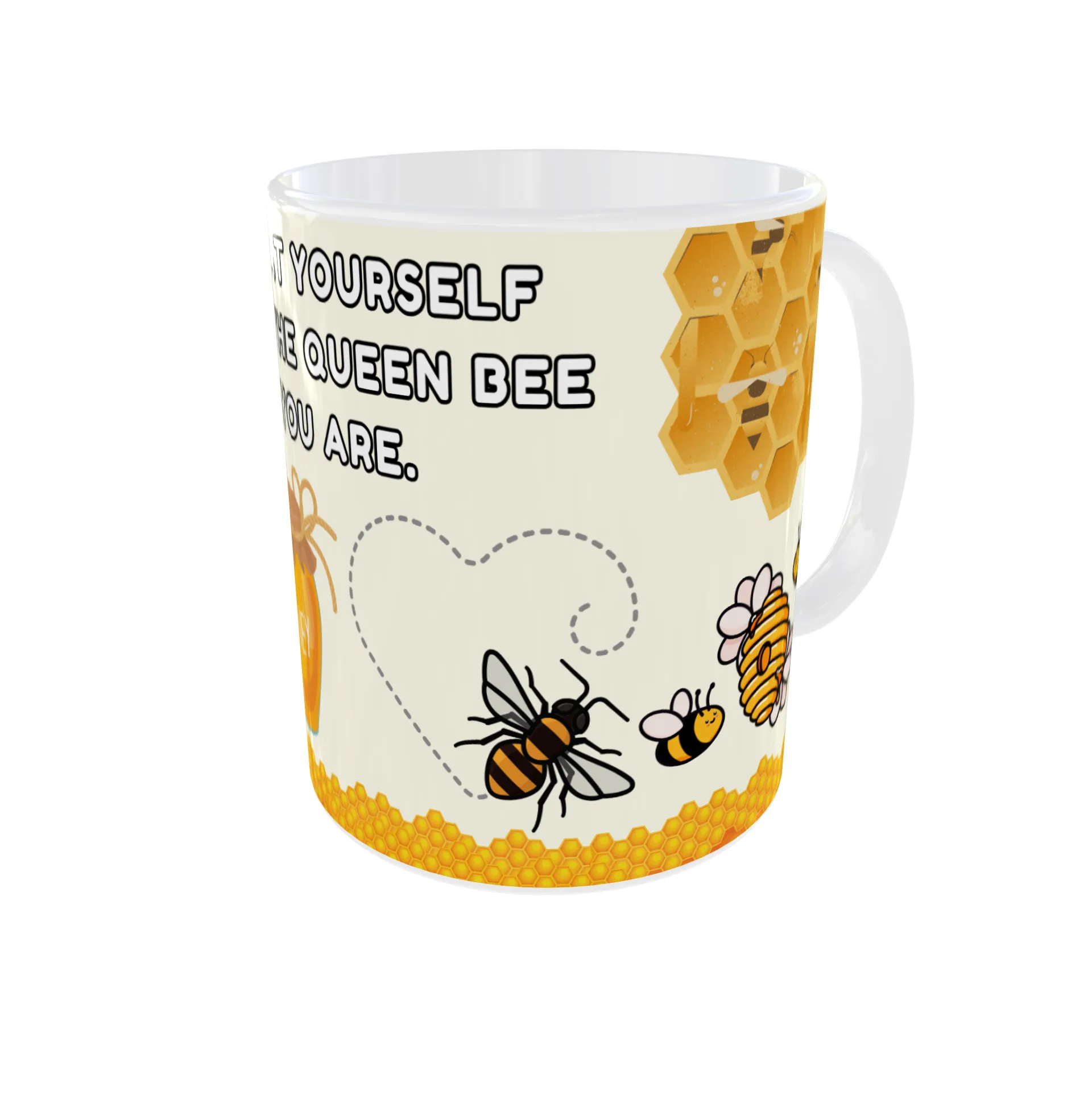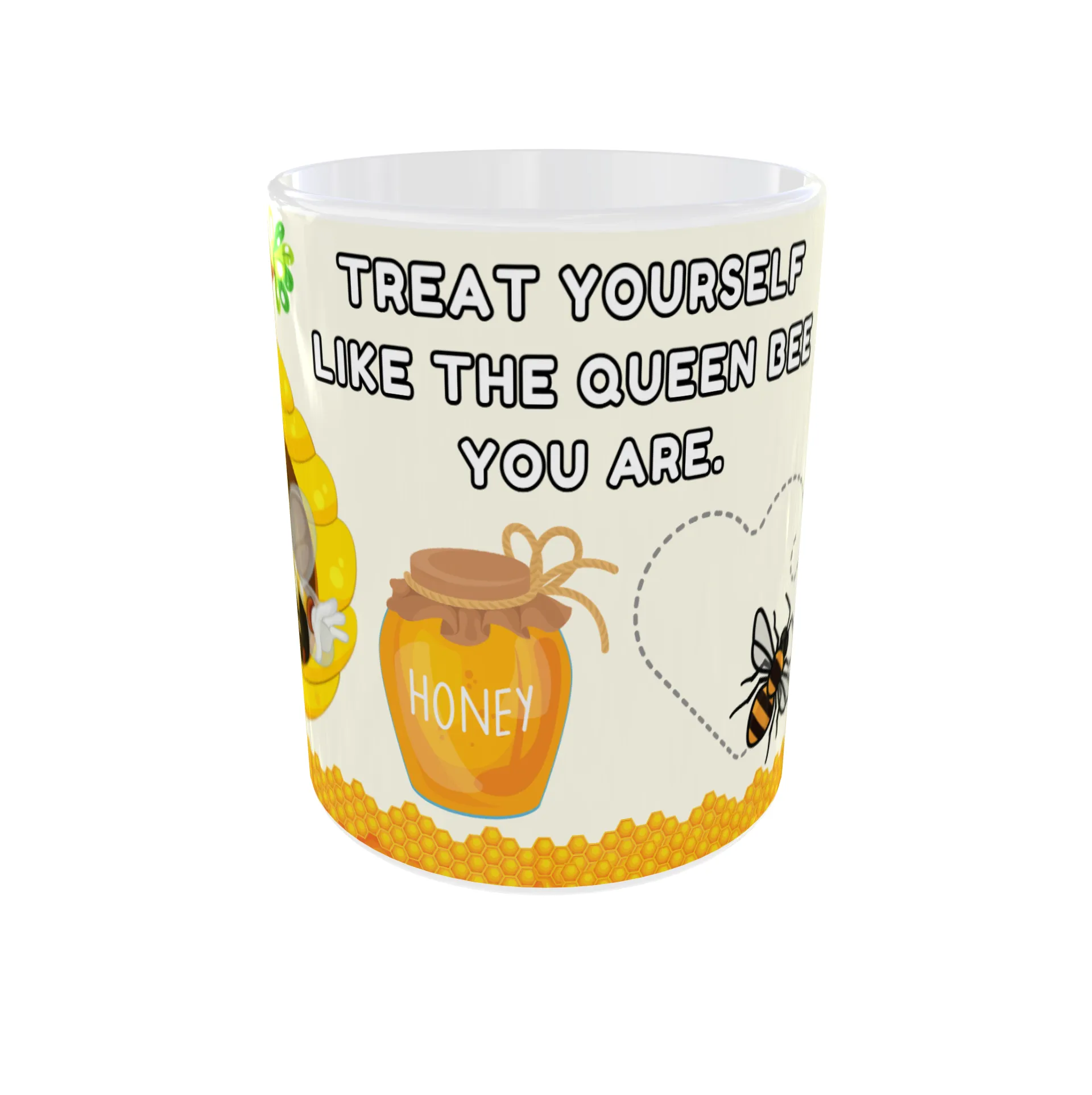 Start your day with a sweet reminder to prioritize your well-being. This cheerful mug features a charming cartoon queen bee in her hive, a jar of honey, and a honeycomb design. The inspiring message, “Treat Yourself Like the Queen Bee You Are,” encourages you to embrace self-care and treat yourself like royalty. The vibrant colors and adorable bee illustrations make this mug a delightful addition to your kitchen—and a perfect gift for the queen bee in your life!