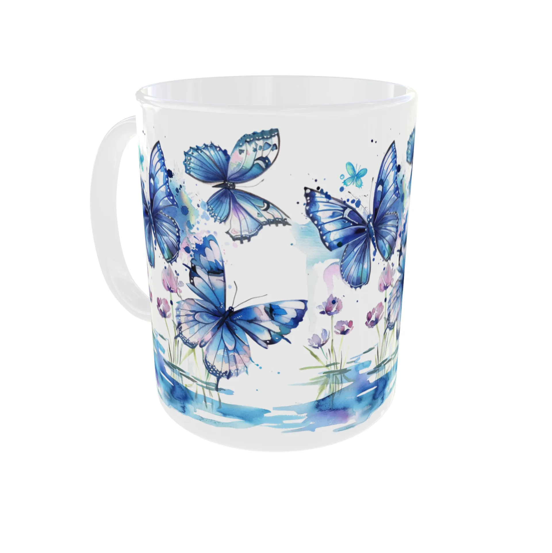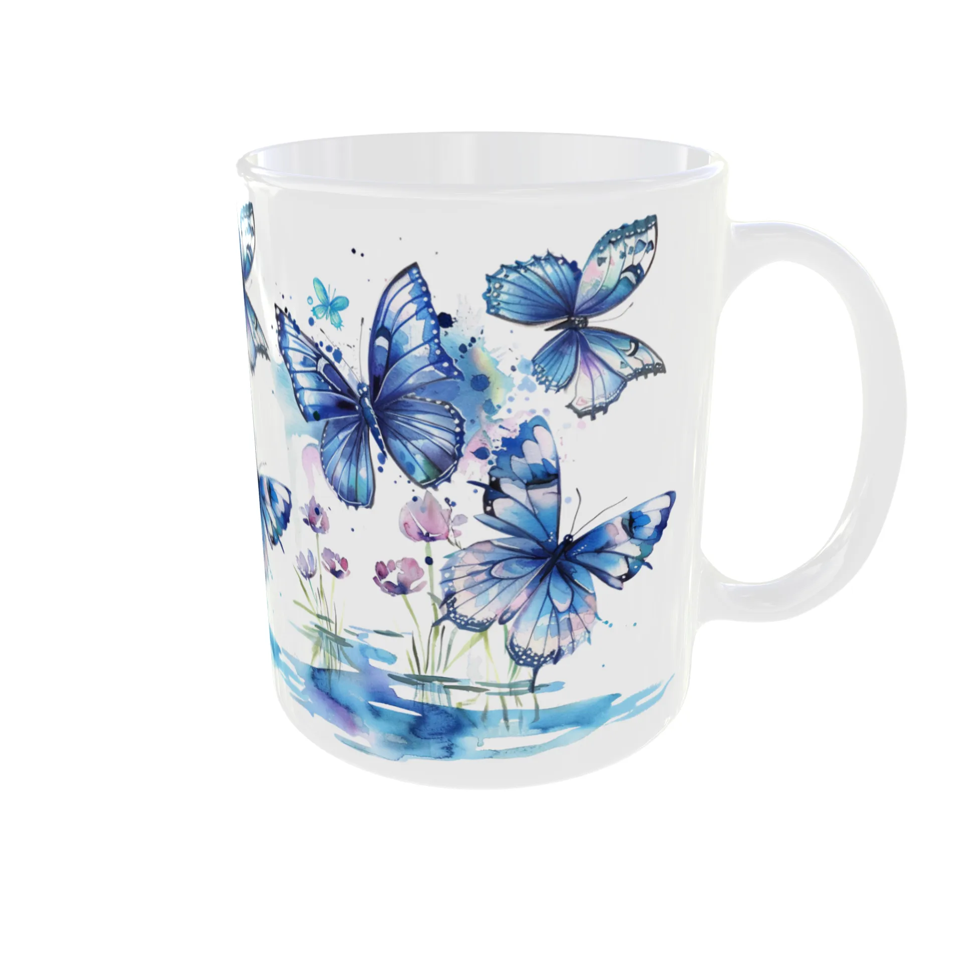 Escape to a serene world with every sip from this beautiful mug. The design features a stunning watercolor painting of delicate blue butterflies fluttering above a tranquil pond, adorned with subtle pink flowers. The gentle hues and ethereal quality of the artwork evoke a sense of peace and tranquility.