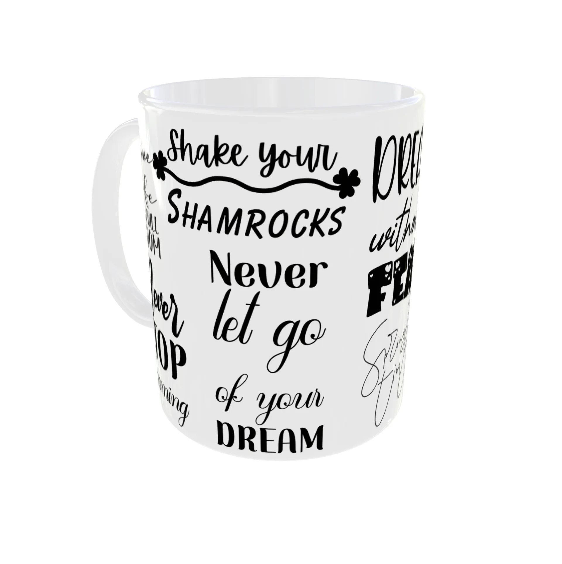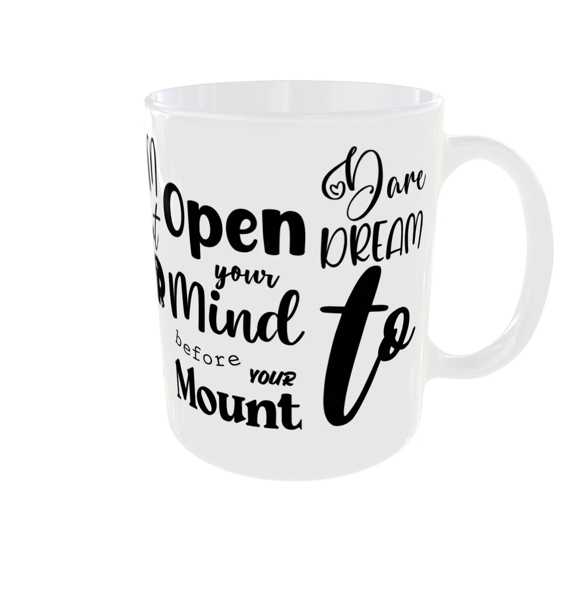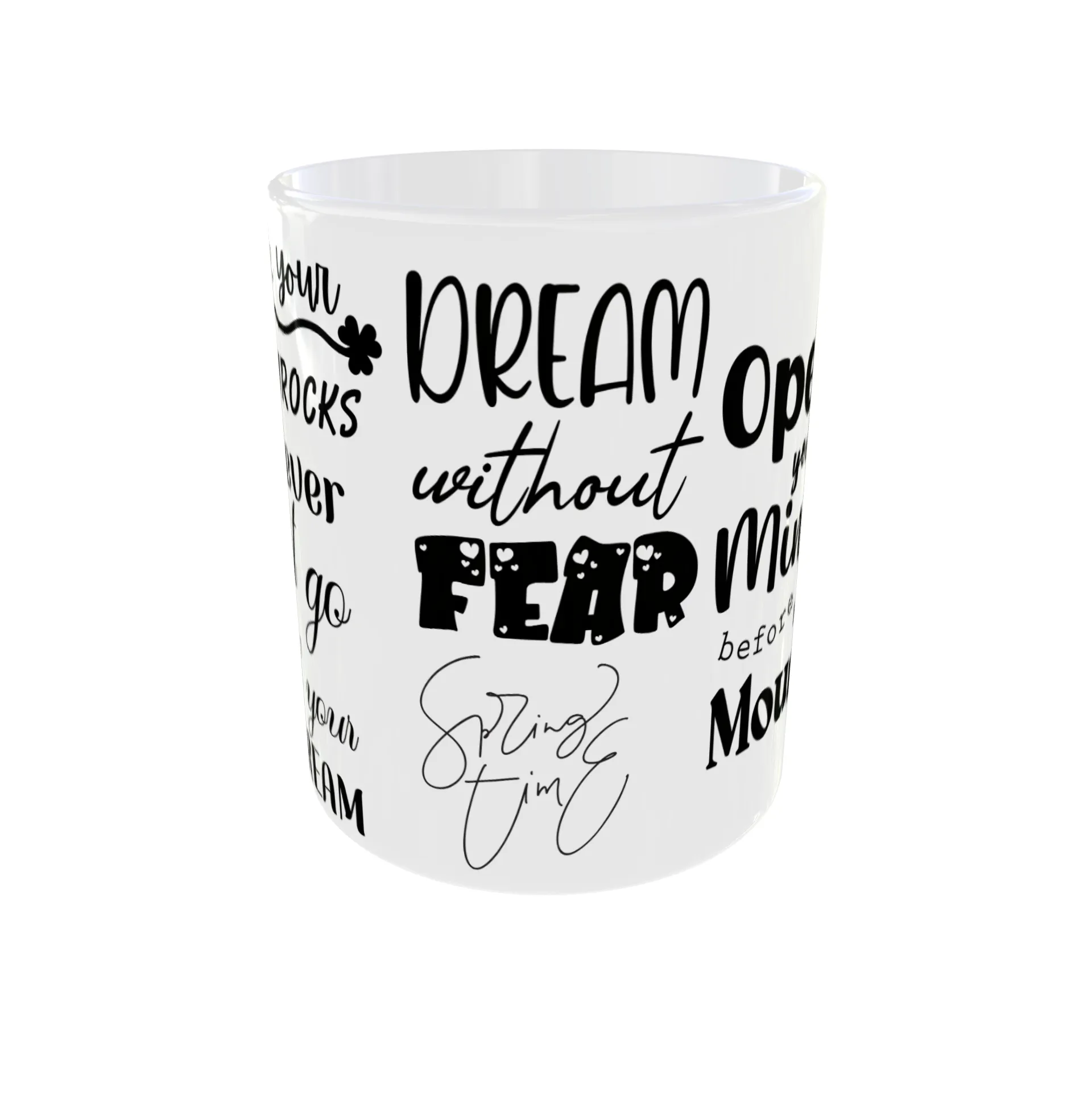 This mug is designed to inspire and uplift. The stylish typography features empowering messages like “Dream Without Fear,” “Never Stop Dreaming,” and “Open Your Mind.” It’s the perfect gift for anyone who needs a daily reminder to pursue their passions and live life to the fullest. The bold black lettering on a crisp white background makes a striking design. Sip your morning coffee or tea and be inspired to conquer your goals.