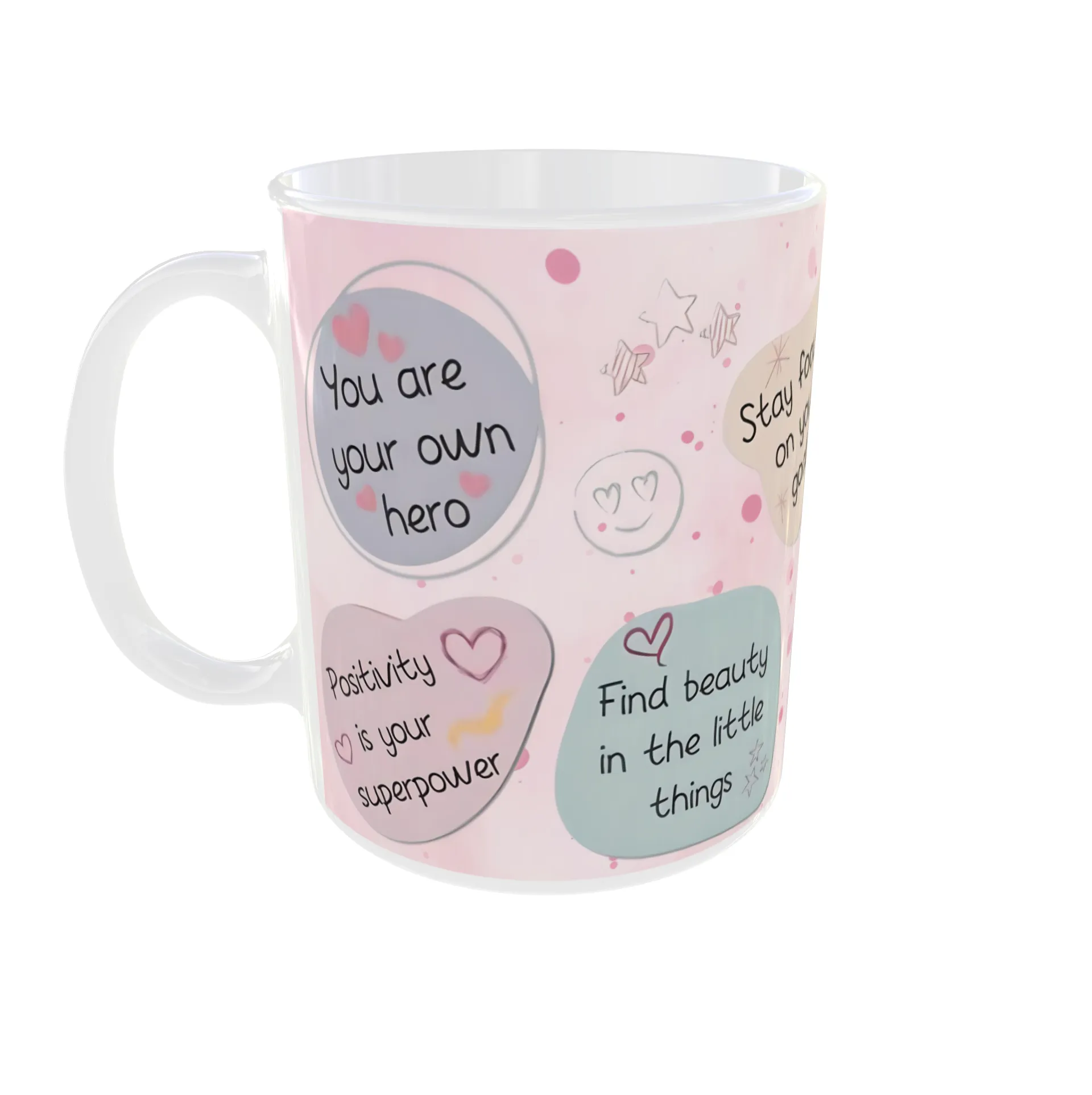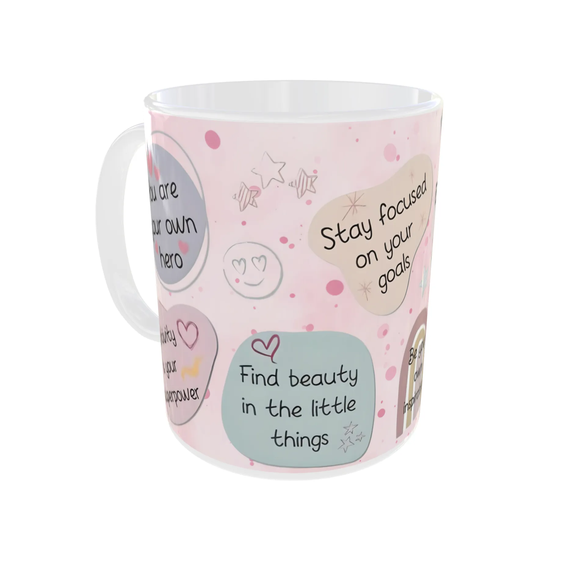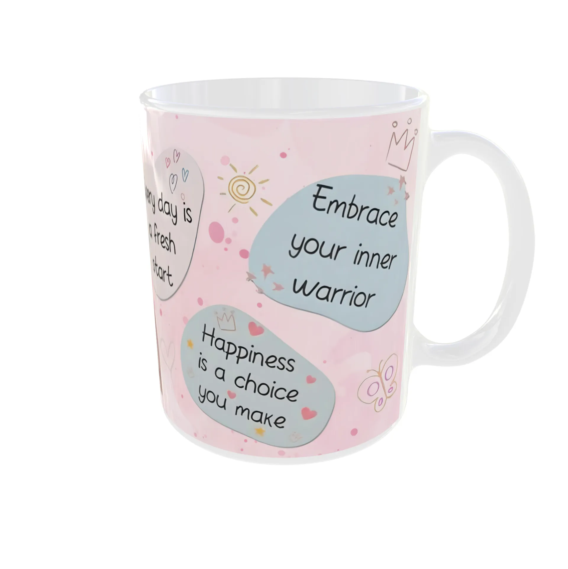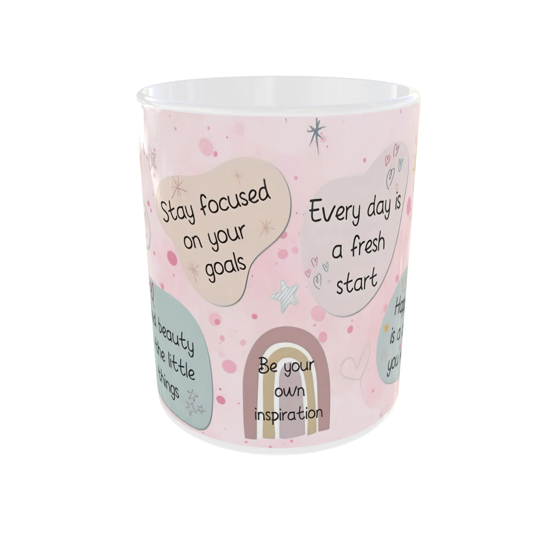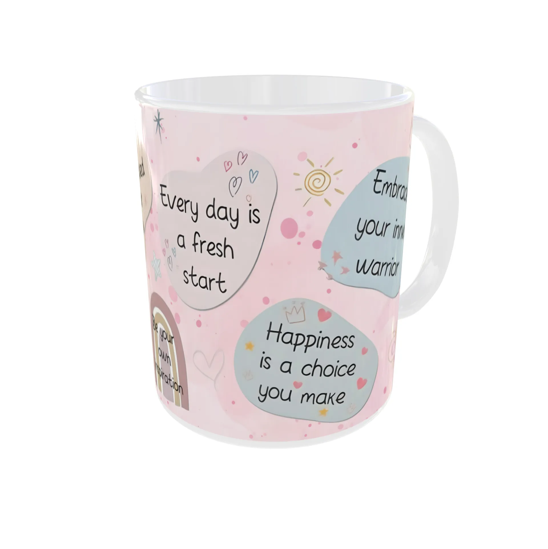 Start your day with a positive mindset! This charming mug is adorned with uplifting messages designed to inspire and empower you. From embracing your inner warrior to finding beauty in the little things, each phrase serves as a daily reminder of your strength and resilience. The soft pastel color palette and whimsical illustrations create a comforting and encouraging atmosphere – the perfect addition to your morning routine.